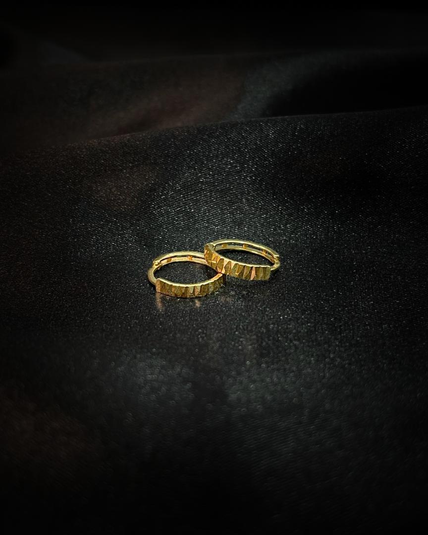 Estas piezas, elaboradas en oro de 18 quilates, presentan una superficie texturizada, diamantadas que crea micro-facetas reflectantes. El resultado es un resplandor continuo que emula el brillo de la pedrería fina, manteniendo la elegancia minimalista del oro puro.
