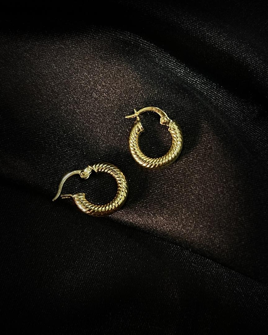 Estas argollas presentan un acabado rayado meticulosamente tallado sobre oro 18 quilates, creando una superficie que atrapa y refleja la luz en múltiples direcciones.