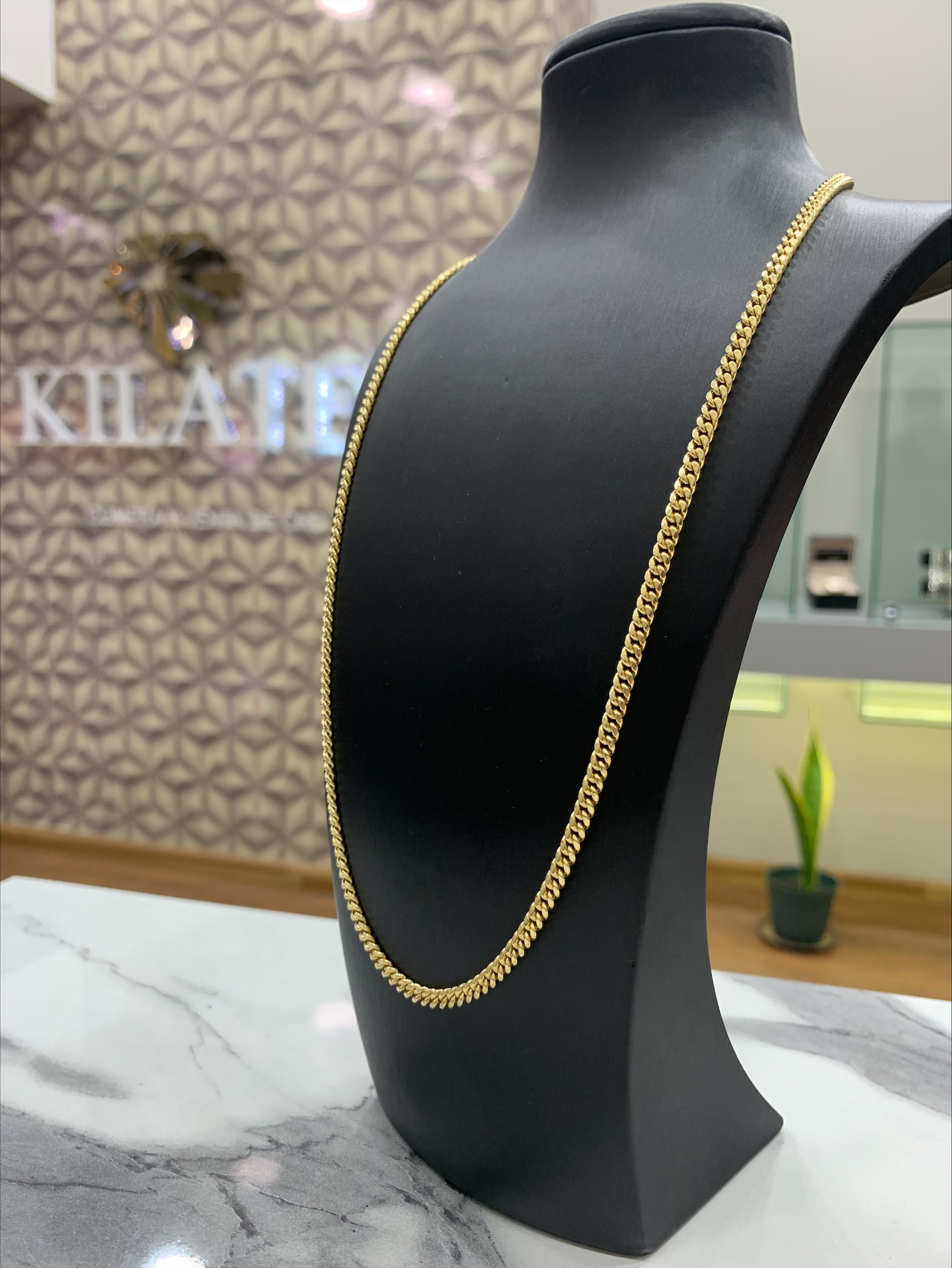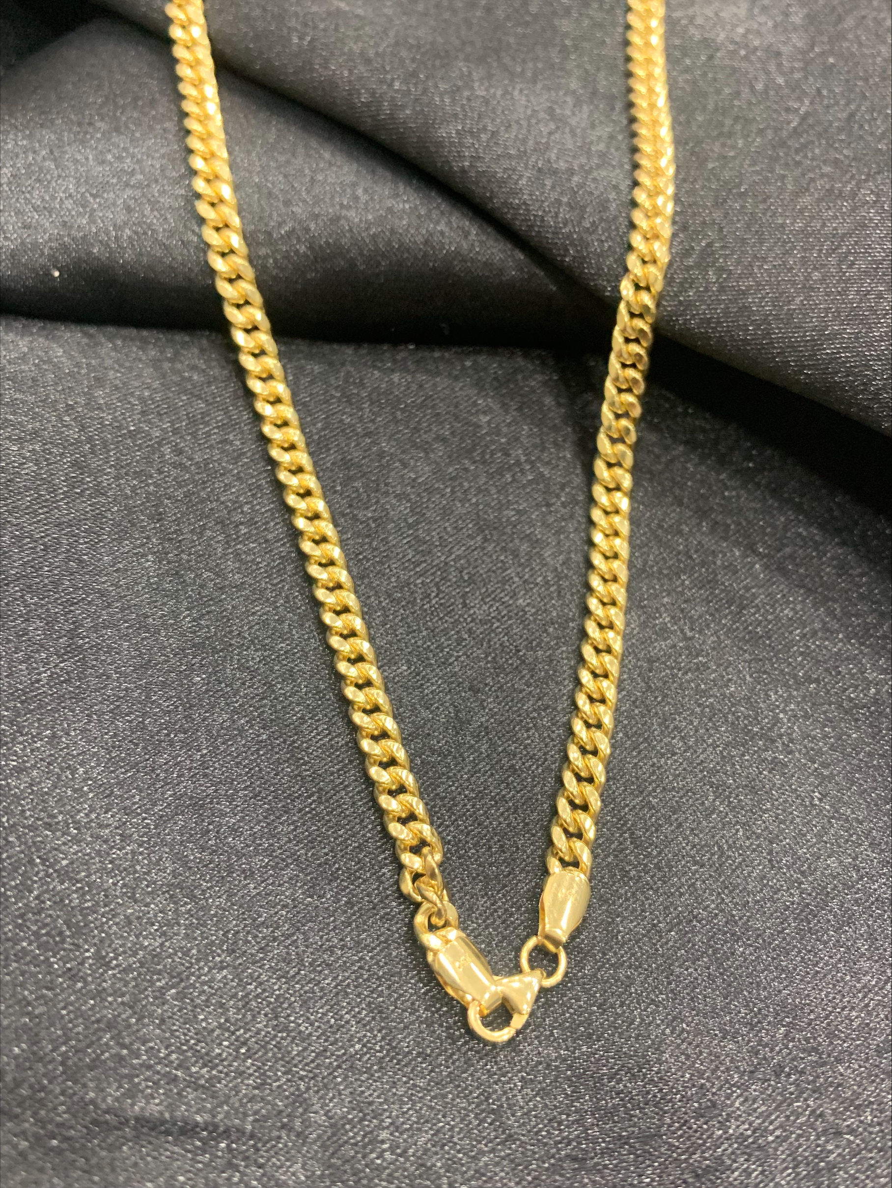 Clásica cadena barbada en Oro Amarillo 18 K. Diseño hueco, más ligero y cómodo. Acabado pulido de alto brillo, Perfecta para un look diario o como regalo de Primera Comunión.