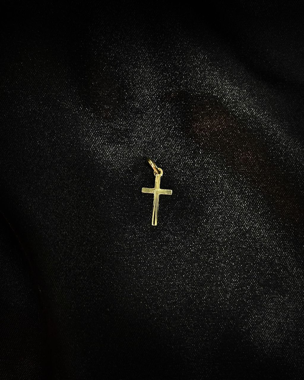 Una pieza que redefine la tradición. Esta cruz de diseño contemporáneo destaca por su exclusivo acabado de textura rayada, trabajado minuciosamente sobre de 18 quilates.