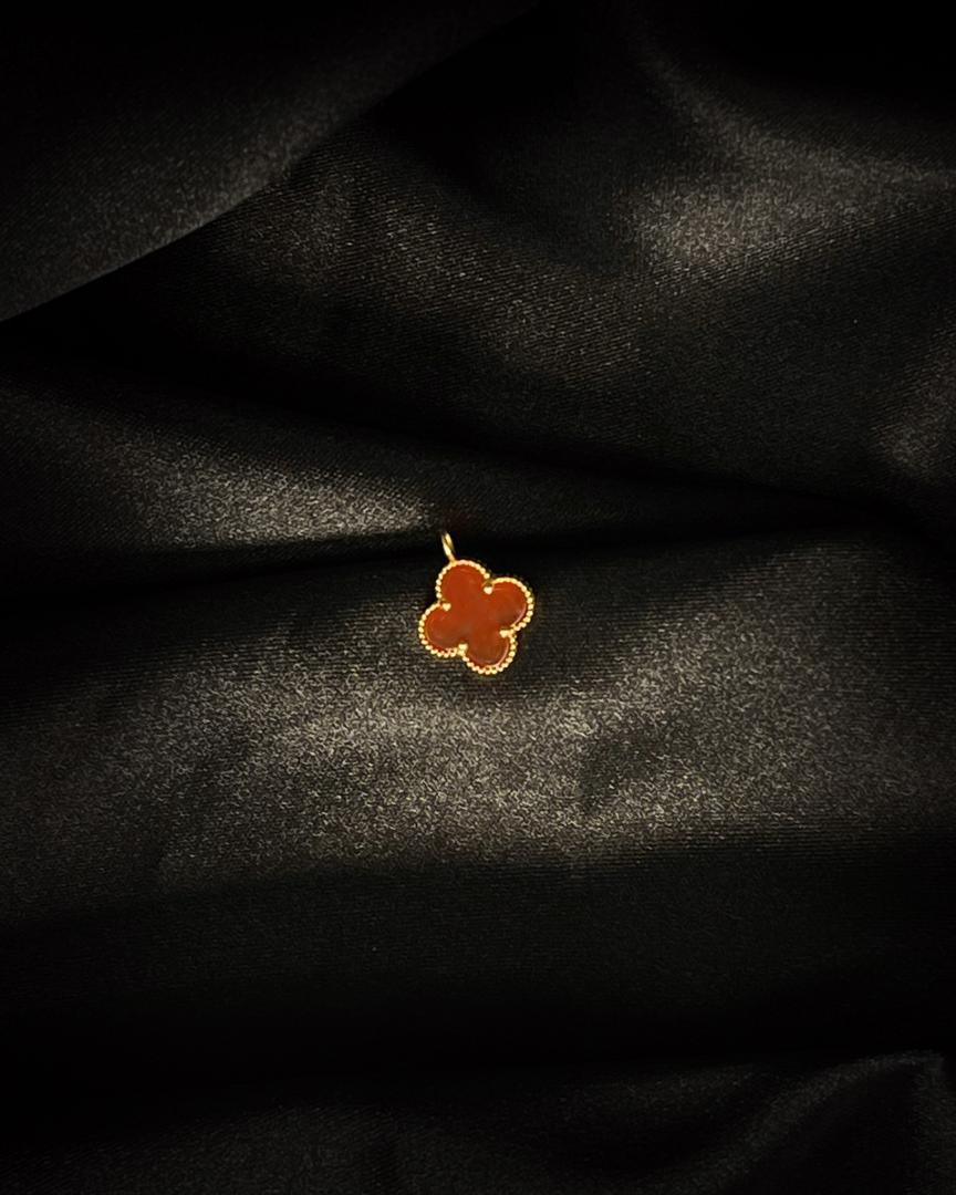 Este dije presenta el legendario motivo de trébol de cuatro hojas, realzado con un vibrante engaste de cornalina roja de la más alta calidad. El contraste entre el rojo profundo de la piedra y el resplandor del oro amarillo de 18 quilates crea una pieza de armonía inigualable.